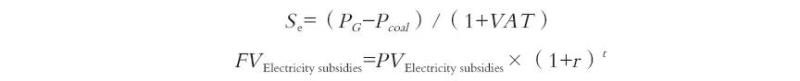 PG為電網(wǎng)企業(yè)收購(gòu)價(jià)格,Pcoal為燃煤標(biāo)桿上網(wǎng)電價(jià),VAT為適用增值稅率。FVElectricity subsidies為終值,PVElectricity subsidies為現(xiàn)值,r為利率,t為期數(shù)。