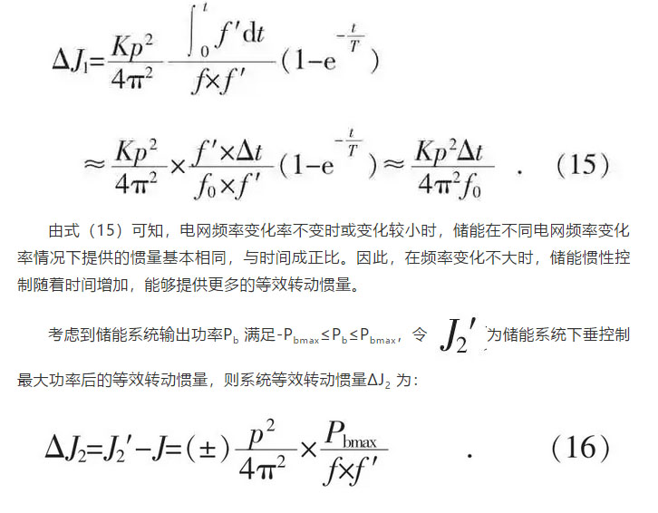 儲(chǔ)能系統(tǒng)對(duì)電網(wǎng)輸出或吸收功率,通過功率交換實(shí)際上提供了系統(tǒng)額外等效慣量。根據(jù)轉(zhuǎn)子運(yùn)動(dòng)方程,計(jì)算了頻率變化時(shí)輸出功率和等效轉(zhuǎn)動(dòng)慣量的關(guān)系。根據(jù)儲(chǔ)能系統(tǒng)典型控制方式,計(jì)算了不同控制方法下儲(chǔ)能系統(tǒng)等效轉(zhuǎn)動(dòng)慣量的特性。