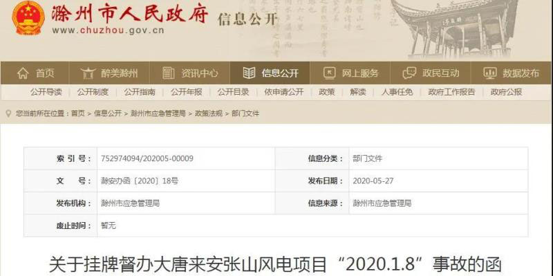 近日,滁州市人民政府發(fā)布《關(guān)于掛牌督辦大唐來安張山風(fēng)電項(xiàng)目“2020.1.8”事故的函》。