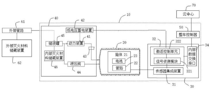 根據(jù)原理,當(dāng)傳感器感應(yīng)到動力電池的熱失控偵測信號,依據(jù)熱失控偵測信號判斷動力電池是否失火,如果判斷為未失火,整車控制器會將信號上傳至云中心;如果判斷為失火,則會啟動滅火裝置對動力電池進(jìn)行滅火工作。