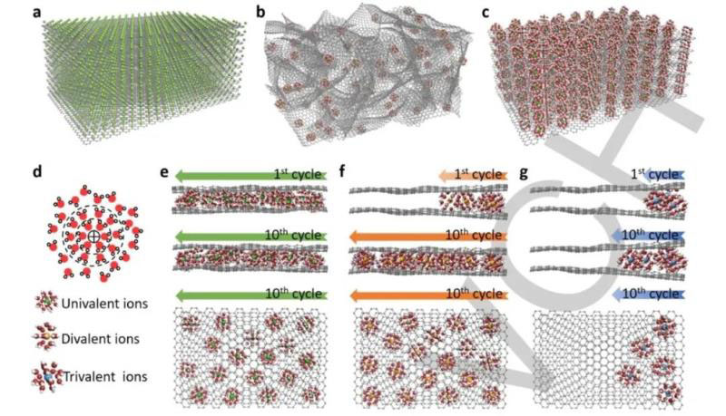 圖1 SCD最大化策略的示意圖。電池型材料a)中的裸離子和電容性材料b)中的溶劑化離子的典型配置 c)在HOPC中密集且整齊地溶劑化離子,可以實(shí)現(xiàn)超高SCD。d)水合陽(yáng)離子的典型構(gòu)。緊湊型HOPC中第1和第10圈電化學(xué)活化后不同離子的分布:e)一價(jià),f)二價(jià)和g)三價(jià)離子。