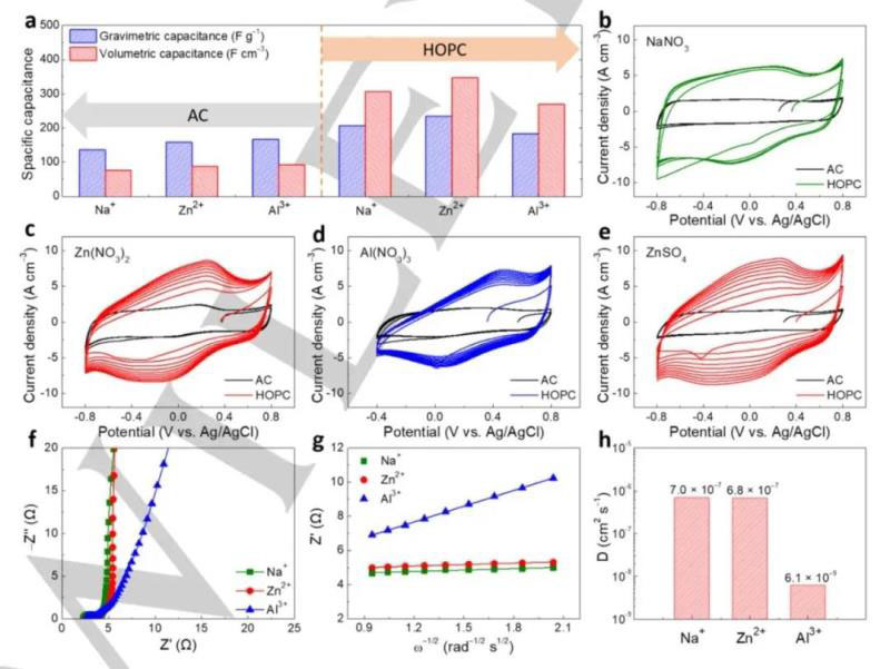 圖2 AC和HOPC中不同離子的電化學(xué)行為。a)AC和HOPC在1 A -1下的重量和體積電容。AC和HOPC在不同電解質(zhì)中的前十個(gè)CV曲線:b)NaNO3,c)Zn(NO3)2,d)Al(NO3)3,e)ZnSO4。HOPC在不同電解質(zhì)中的奈奎斯特圖f),在低頻區(qū)域g)中對(duì)應(yīng)于角頻率的真實(shí)電阻(Z')的線性圖以及導(dǎo)出的離子擴(kuò)散系數(shù)h)。