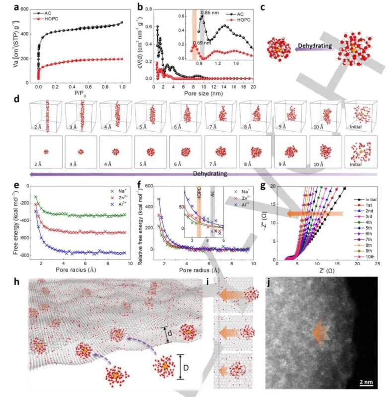 隨后,研究者進(jìn)行了理論研究。如圖3a所示,氮吸附/解吸曲線表明微孔(<2 nm)和中孔(2-50 nm)同時(shí)存在HOPC和AC。近一步的,HOPC和AC的孔徑分布(PSD)通過(guò)密度泛函理論(DFT)進(jìn)行計(jì)算。如圖3b所示,HOPC和AC的最小孔的PSD峰分別位于0.69 nm和0.86 nm處,即半徑分別為0.345 nm和0.430 nm。他們推斷,當(dāng)大的離子進(jìn)入HOPC的最小孔時(shí),它們將經(jīng)歷部分脫水過(guò)程(圖3c)。為跟蹤這一過(guò)程,進(jìn)行了蒙特卡洛模擬,其中裸離子固定在圓柱孔的中心,并被72個(gè)水分子的水合殼包圍(圖3d)。他們以該方式,計(jì)算了相對(duì)于孔半徑的系統(tǒng)自由能,如圖3e所示。隨著孔徑的減小,孔徑效應(yīng)逐漸出現(xiàn),所有三個(gè)離子的系統(tǒng)自由能逐漸增加,盡管總體趨勢(shì)相似,但增加速率卻大不相同。如圖3f所示,當(dāng)孔半徑小于5?時(shí),每個(gè)離子的相對(duì)自由能開始增加,并且Al3+離子的增加速率比Na+和Zn2+離子的增加速率快得多。這種現(xiàn)象表明,Al3+離子脫水到一定尺寸后進(jìn)入相對(duì)較小的孔要困難得多,這主要?dú)w因于裸露的Al3+離子周圍的電場(chǎng)要強(qiáng)得多,因此所需的脫水能量更大。圖3f顯示了2.5?<r <5?區(qū)域的放大圖,該區(qū)域涵蓋了HOPC和AC的特征孔徑。進(jìn)入這些孔的Na+和Zn2+離子幾乎沒(méi)有自由能變化,而進(jìn)入Al3+離子的自由能略有增加,這表明進(jìn)入的離子是Na+,Zn2+和部分脫水的Al3+。對(duì)于HOPC,其特征孔徑(0.345 nm)小于所有三個(gè)離子的孔徑。因此,對(duì)于進(jìn)入HOPC的離子來(lái)說(shuō),部分脫水是必不可少的程序。
