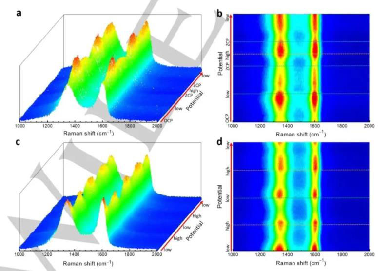 圖5原始的HOPC電極a,b)和活化的HOPC c,d)在ZnSO4電解質(zhì)中的原位拉曼光譜。