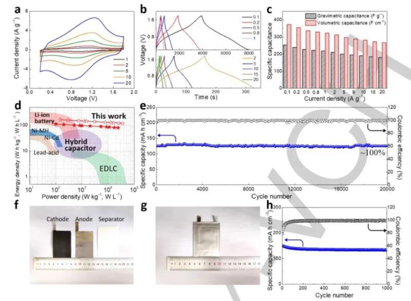 圖6基于HOPC的ZIC的電化學(xué)性能。a)不同掃描速率的CV曲線。b)不同電流密度下的GCD曲線。c)在不同電流密度下的重量和體積電容。d)基于HOPC的ZIC與其他最新EES設(shè)備能量/功率密度的比較。e)基于HOPC的ZIC在5 A g-1的電流密度下的長(zhǎng)循環(huán)穩(wěn)定性。f)袋式電池ZIC的HOPC正極,鋅箔負(fù)極和濾紙隔膜的數(shù)碼照片。g)組裝好的袋式電池ZIC的照片。h)袋式電池ZIC在1 A g-1的電流密度下的長(zhǎng)循環(huán)穩(wěn)定性。