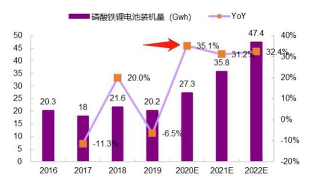 興業(yè)證券預(yù)計,今年磷酸鐵鋰電池在汽車行業(yè)的裝機量將達(dá)到27.3Gwh,至2022年將達(dá)到47.4Gwh,而真鋰研究也預(yù)測,今年國內(nèi)磷酸鐵鋰動力電池總裝機量將升至28Gwh,年復(fù)合增長率為32.7%。