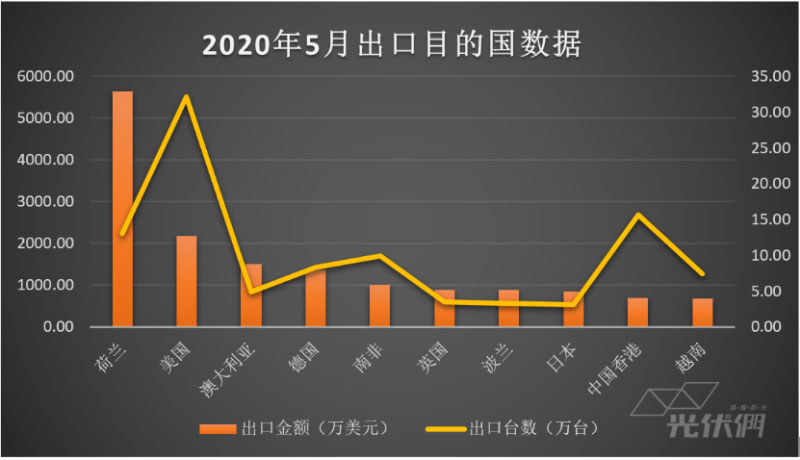 從出口國來看,荷蘭依舊保持第一大出口目的國,占據(jù)全部出口數(shù)據(jù)的24.71%,比上個月上升了四個百分點,美國、澳大利亞、德國、南非、英國、波蘭、日本、香港和越南也進(jìn)入了排名前十。南非、英國和波蘭的出口金額增長明顯,分別排在第五到第七。波蘭1-4月光伏裝機(jī)總量達(dá)533.2MW,本地電網(wǎng)運營商PSE表示,截至2020年4月波蘭累計光伏裝機(jī)量到1.83GW。