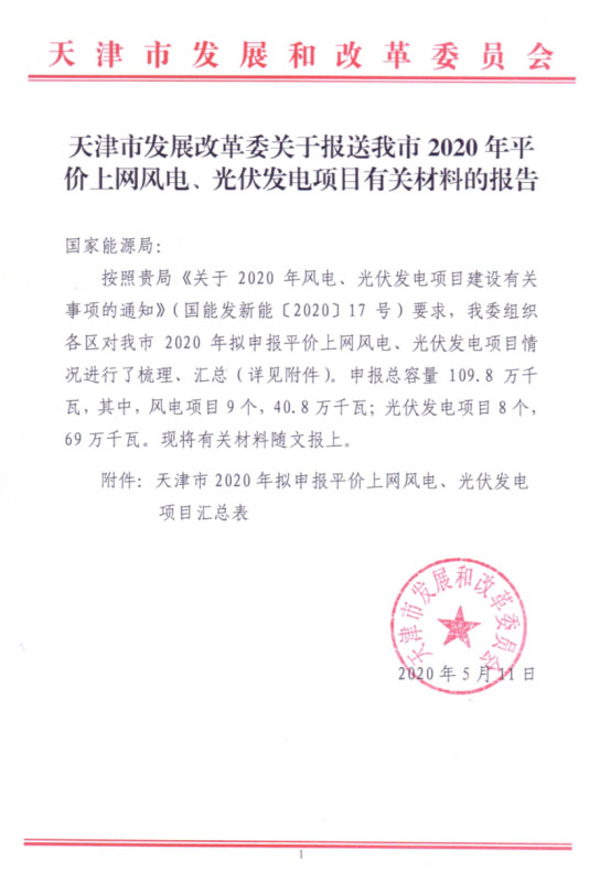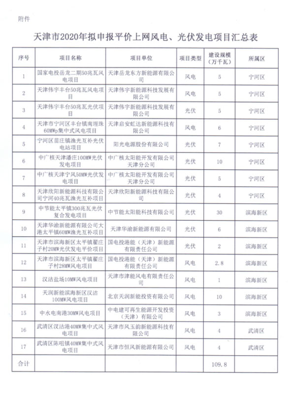 近日,天津市發(fā)改委發(fā)布了關(guān)于2020年平價(jià)上網(wǎng)風(fēng)電、光伏發(fā)電項(xiàng)目有關(guān)材料報(bào)告。根據(jù)通知,天津市平價(jià)項(xiàng)目申報(bào)總?cè)萘?.098GW,其中光伏項(xiàng)目8個(gè),共690MW;風(fēng)電項(xiàng)目9個(gè),共408MW。