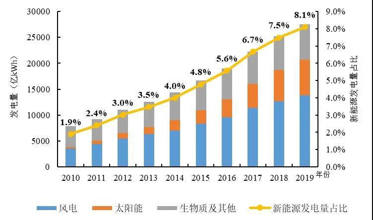 圖2 2010-2019年全球新能源發(fā)電量及占比