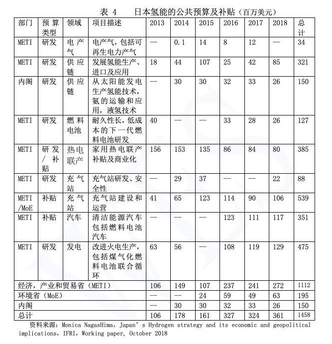 資金支持是日本氫能產(chǎn)業(yè)發(fā)展的重要因素之一。經(jīng)濟(jì)產(chǎn)業(yè)和貿(mào)易省(METI)是日本氫能研究的主要資助機(jī)構(gòu),其資助主要通過(guò)日本最大的公立研究開發(fā)管理機(jī)構(gòu)——新能源和產(chǎn)業(yè)技術(shù)綜合開發(fā)機(jī)構(gòu)(NEDO)提供。此外,日本環(huán)境省(MoE)和內(nèi)閣也資助了氫能的研發(fā)和補(bǔ)貼。據(jù)不完全統(tǒng)計(jì),2013--2018年,這三家機(jī)構(gòu)共資助了14.58億美元的氫能研發(fā)和補(bǔ)貼經(jīng)費(fèi),其中經(jīng)濟(jì)產(chǎn)業(yè)和貿(mào)易省11.12億美元,環(huán)境省1.95億美元,內(nèi)閣1.5億美元,具體金額和項(xiàng)目見表4。此外,經(jīng)濟(jì)產(chǎn)業(yè)和貿(mào)易省和環(huán)境省每年還撥出約1.5億美元用于碳捕捉和儲(chǔ)存(CCS)的研發(fā),這對(duì)于化石燃料零排放氫能的生產(chǎn)至關(guān)重要,這一研究預(yù)計(jì)到2020年會(huì)取得初步成果。