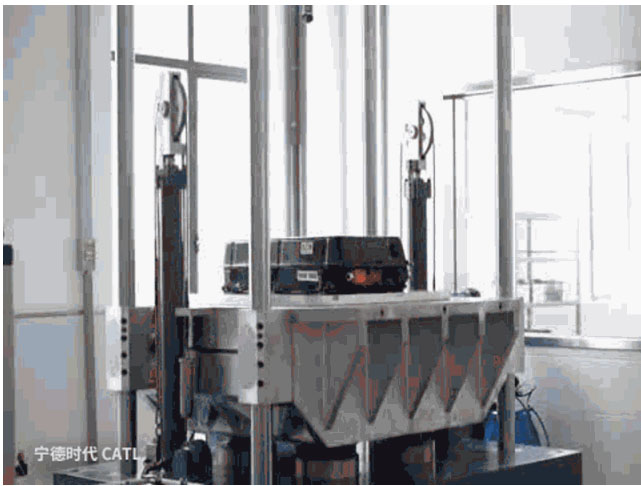 這是寧德時代的一座推力20噸的振動臺,用來模擬電池包在實際使用中會遇到的顛簸路況,但其振動強烈程度更甚于實際路況。在試驗中,電池包一秒鐘要被振動200下,而電芯模組則要被振動2000下。蜜蜂的翅膀每秒鐘振動400下,我們就可以聽到“嗡嗡”的聲音,每秒振動2000下的電芯模組所發(fā)出的聲音是非常尖銳刺耳的。