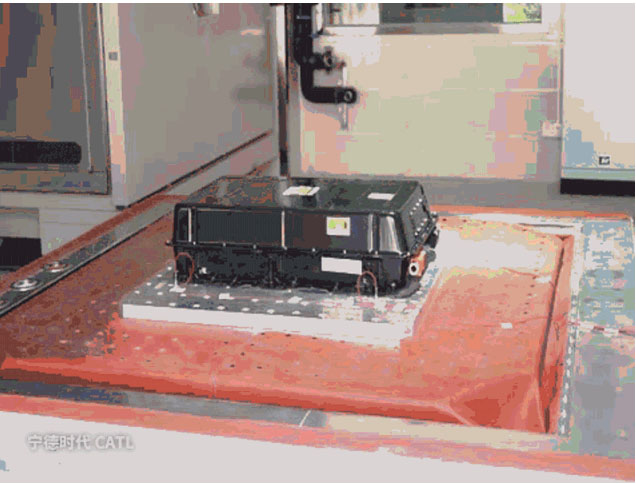 從圖中可以看到,在10噸外部力量的擠壓下,復合鋁材質的電池包外殼已出現(xiàn)了明顯的變形,但電池包整體結構完整。對于擠壓測試的通過標準一般是不起火、不爆炸。而寧德時代的電池產(chǎn)品,甚至可以在擠壓變形的情況下,繼續(xù)正常工作。