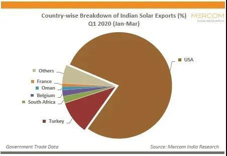 在2019-20財年,該行業(yè)看到了印度太陽能出口的增長,特別是對美國的出口。印度向美國出口占比接近81%,其次是土耳其(4.5%)和比利時(3.2%)。相比之下,印度在2018-19財年向美國出口了約44%的產(chǎn)品。