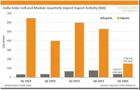 根據(jù)最新的貿(mào)易數(shù)據(jù),2020年一季度,印度太陽能進口額同比暴跌77%至1.51億美元,而去年同期為6.5億美元。