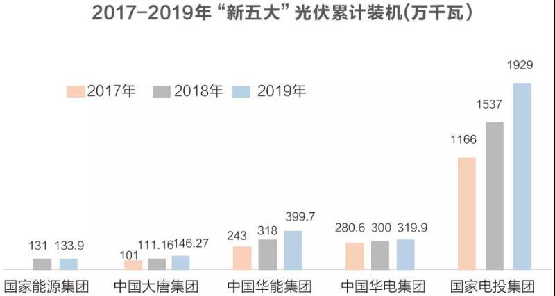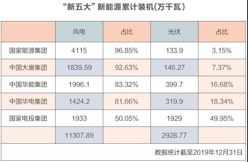 毫無疑問,“新五大”同樣是發(fā)展新能源的主力軍。《能源》雜志統(tǒng)計數(shù)據(jù)顯示,截至2019年底,“新五大”發(fā)電集團的風(fēng)電累計裝機量為11307.89萬千瓦,超過了全國風(fēng)電裝機的一半,而光伏裝機量為2928.77萬千瓦,在光伏裝機總量中占比較小。