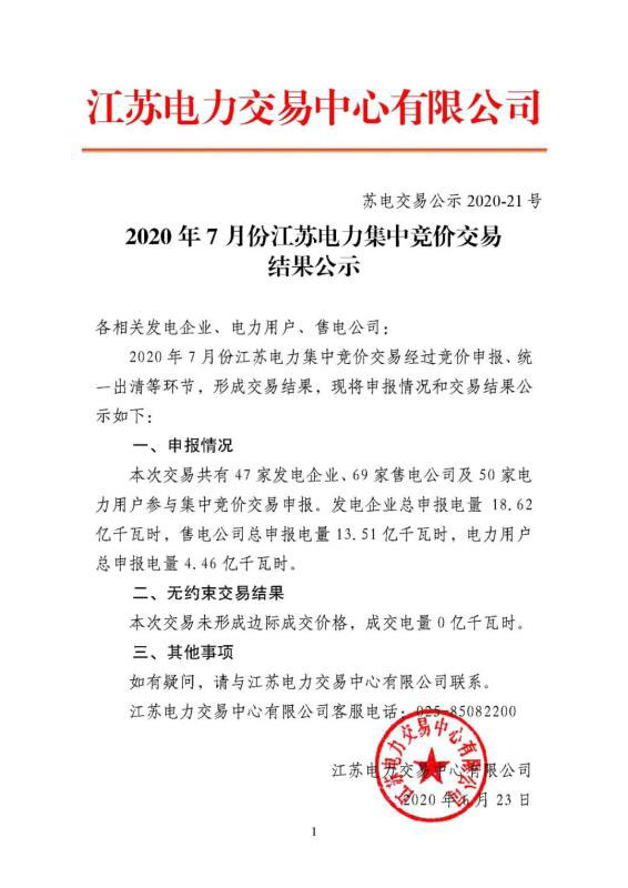 2020年7月份江蘇電力集中競價交易結(jié)果公示