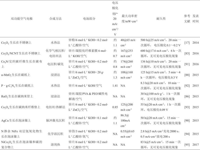 (2)高度結(jié)構(gòu)化的空氣電極設(shè)計(jì)與制備工藝開發(fā)。現(xiàn)在的鋅-空氣電池研究與堿性燃料電池十分相似,使用碳材料為基底,如Toray碳紙等,然而碳材料在反復(fù)的充放電過程中,極易發(fā)生碳蝕現(xiàn)象。而且,空氣電極的制備過程十分繁瑣,輔助成分的添加也會產(chǎn)生一些不利的影響。催化劑與基底間作用力較弱時極易脫落,造成電池性能的衰減。因此,需要發(fā)展一些新型結(jié)構(gòu)的空氣電極結(jié)構(gòu),使電池的使用周期更長。