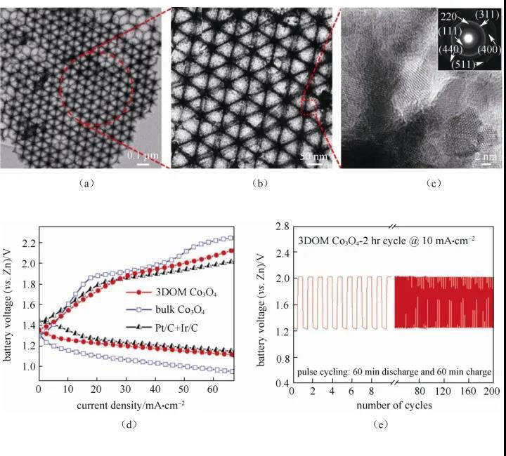 圖3 3DOM Co3O4的TEM圖及可充電鋅空電池充放電性能及循環(huán)穩(wěn)定性