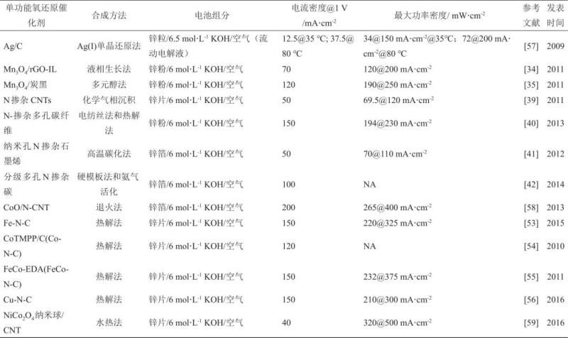 表1 一次鋅-空氣電池單功能氧還原催化劑
