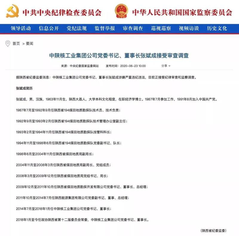 6月23日上午,中央紀(jì)委國(guó)家監(jiān)委網(wǎng)站援引陜西省紀(jì)委監(jiān)委又發(fā)出消息,中陜核工業(yè)集團(tuán)公司黨委書記、董事長(zhǎng)張斌成涉嫌嚴(yán)重違紀(jì)違法,目前也正接受紀(jì)律審查和監(jiān)察調(diào)查。
