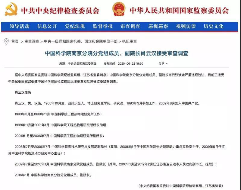 6月22日晚間,中央紀(jì)委國(guó)家監(jiān)委網(wǎng)站援引中央紀(jì)委國(guó)家監(jiān)委駐中國(guó)科學(xué)院紀(jì)檢監(jiān)察組、江蘇省監(jiān)委消息:中國(guó)科學(xué)院南京分院分黨組成員、副院長(zhǎng)肖云漢涉嫌嚴(yán)重違紀(jì)違法,目前正接受中央紀(jì)委國(guó)家監(jiān)委駐中國(guó)科學(xué)院紀(jì)檢監(jiān)察組紀(jì)律審查和江蘇省監(jiān)委監(jiān)察調(diào)查。