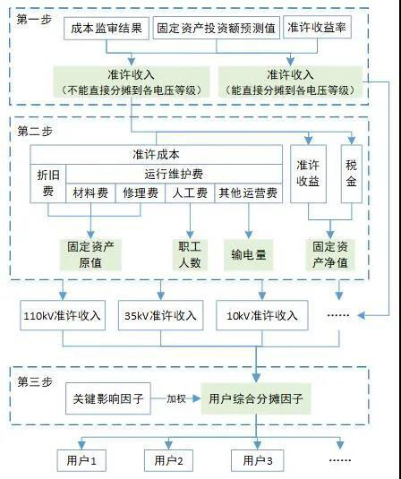 為了公平分?jǐn)偱潆姕?zhǔn)許收入,本文引入用戶綜合分?jǐn)傄蜃拥母拍?,在考慮成本動因的同時,進(jìn)一步考慮不同類型用戶間的分?jǐn)???紤]用戶綜合分?jǐn)傄蜃雍统杀緞右虻呐潆姕?zhǔn)許收入分?jǐn)倷C(jī)制下圖所示: