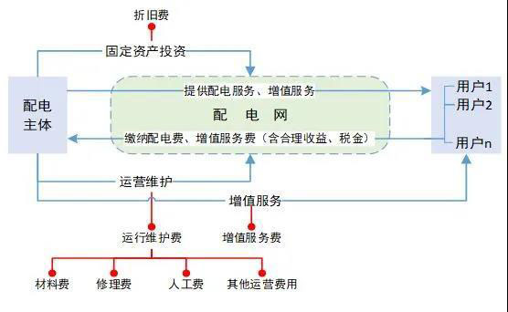 配網(wǎng)運(yùn)營商在建設(shè)期和運(yùn)營期會發(fā)生固定資產(chǎn)投資(如變電站、開閉所、配電線路、用戶專項工程等),在運(yùn)營期需要對配電資產(chǎn)進(jìn)行日常運(yùn)營和維護(hù),同時對電力用戶提供增值服務(wù)、繳納增值稅等,整個過程都會產(chǎn)生成本和費(fèi)用。電力用戶為其享受的配電服務(wù)和增值服務(wù)所發(fā)生的成本買單,配電主體通過向用戶收取配電費(fèi)、增值服務(wù)費(fèi)彌補(bǔ)成本并獲得合理收益。增值服務(wù)費(fèi)與用戶享受的增值服務(wù)水平有關(guān),由配網(wǎng)運(yùn)營商向電力用戶單獨(dú)額外收取,不計入配電定價成本。