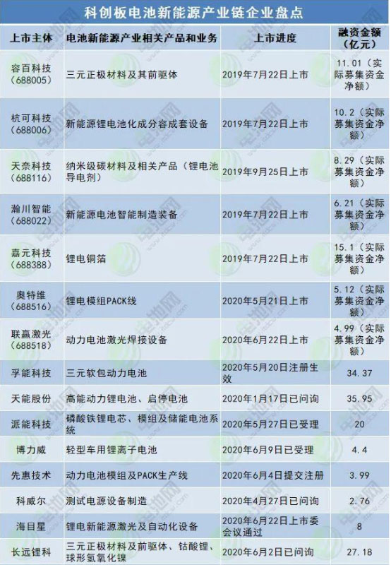 加上去年登陸科創(chuàng)板的鋰電池正極材料生產(chǎn)企業(yè)容百科技(688005),鋰電池設(shè)備生產(chǎn)企業(yè)杭可科技(688006)、瀚川智能(688022),鋰電池碳納米管導(dǎo)電劑生產(chǎn)企業(yè)天奈科技(688116),鋰電池銅箔生產(chǎn)企業(yè)嘉元科技(688388)5家企業(yè),至此,已有7家電池新能源產(chǎn)業(yè)鏈成功在科創(chuàng)板上市。