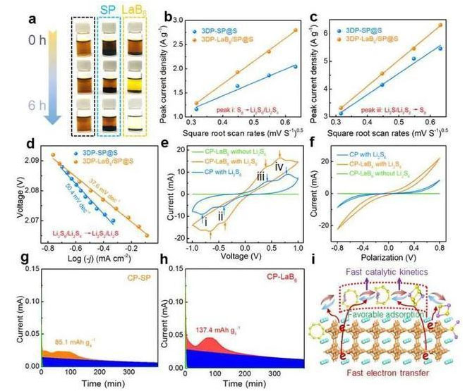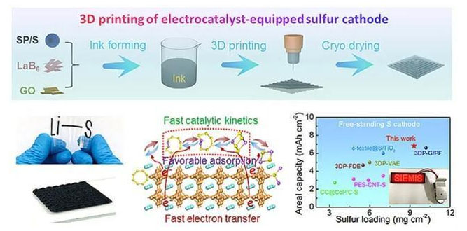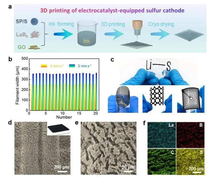 研究人員利用3D打印技術,方便、高效、便捷地構筑了高負載硫正極,該架構具有經過優(yōu)化的離子/電子傳輸通道和充足的孔隙率,有利于對多硫化物進行高效管理。同時,為了更好地抑制“穿梭效應”,研究人員設計了包含硫/碳和LaB6電催化劑的混合墨汁,用于打印高性能的硫正極。金屬性LaB6電催化劑可以均勻地分布在3D打印的架構內,自發(fā)地確保有豐富的活性位點用于多硫化物的固定和轉化,從而實現(xiàn)高效率的放電或充電過程。