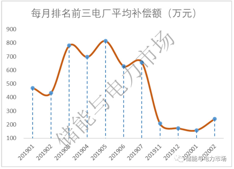 (2)排名較前的電廠,月度補償額位于200萬元左右,與蒙西電網(wǎng)總補償額變化趨勢一致