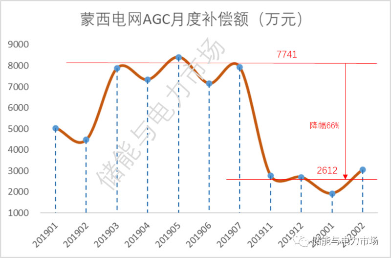 2019年11月,蒙西電網(wǎng)的AGC月度補償總額大幅跳水,相對于2019年7月的7925萬元,跌為2778萬元,跌幅65%。造成這一結果主要有兩個原因: