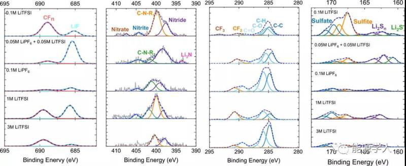 對(duì)測試后正極(圖8)的XPS分析表明,在所有電解質(zhì)成分的情況下,LiTFSI鹽和電解質(zhì)溶劑的分解與CEI的形成略有不同。對(duì)于低濃度電解質(zhì),CEI種類主要包括:CFn、LiF、含N化合物、亞硫酸鹽,和硫酸鹽(圖9)??偟膩碚f,電解液中即使有1/10–1/3的鹽濃度,顯然也足以再現(xiàn)在1M和3M電解液組成中形成的保護(hù)性CEI的組成。含有0.05–0.1M LiF6的電解質(zhì)顯示出較低的CF2強(qiáng)度,而大多數(shù)LiTFSI電解質(zhì)具有較高的LiF與CFn。有趣的是,只有由0.05M LiPF6和0.05M LiTFSi組成的電解液中含有最明顯的Li3N,這是一種對(duì)電極保護(hù)非常重要的化合物。