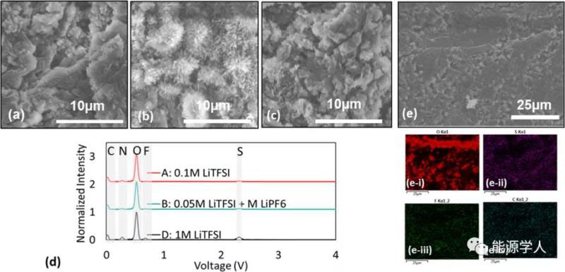 圖7(a)0.1M LiTFSI,(b)0.05M LiTFSI+0.05M LiPF6,(C)1M LiTFSI電池,(d)Li箔的EDS圖,(e)在0.05M LiTFSI+0.05M LiPF6中測試后的Li箔的EDS圖。