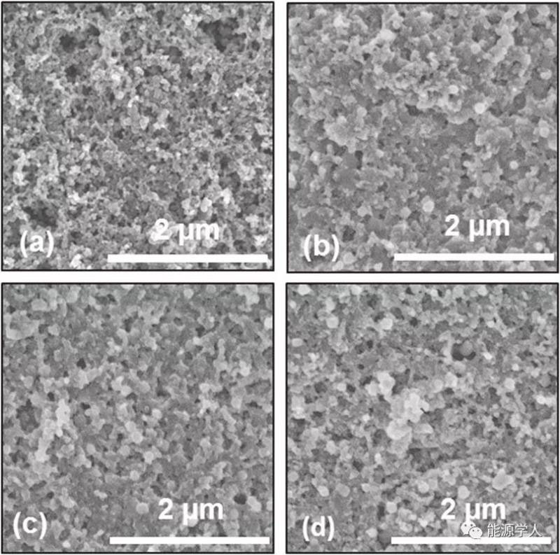 圖6(a)原始電極和在(b)0.1M LiTFSI,(C)0.05MLiTFSI+0.05M LiPF6,(d)1M LiTFSI中循環(huán)后的SEM圖。