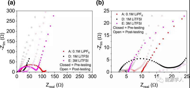 對(duì)比長循環(huán)前后的EIS結(jié)果(圖5),發(fā)現(xiàn)0.1M電解質(zhì)的阻抗降低幅度最大。然而,3M電解質(zhì)在循環(huán)后表現(xiàn)出最大的阻抗和最大的界面電阻。