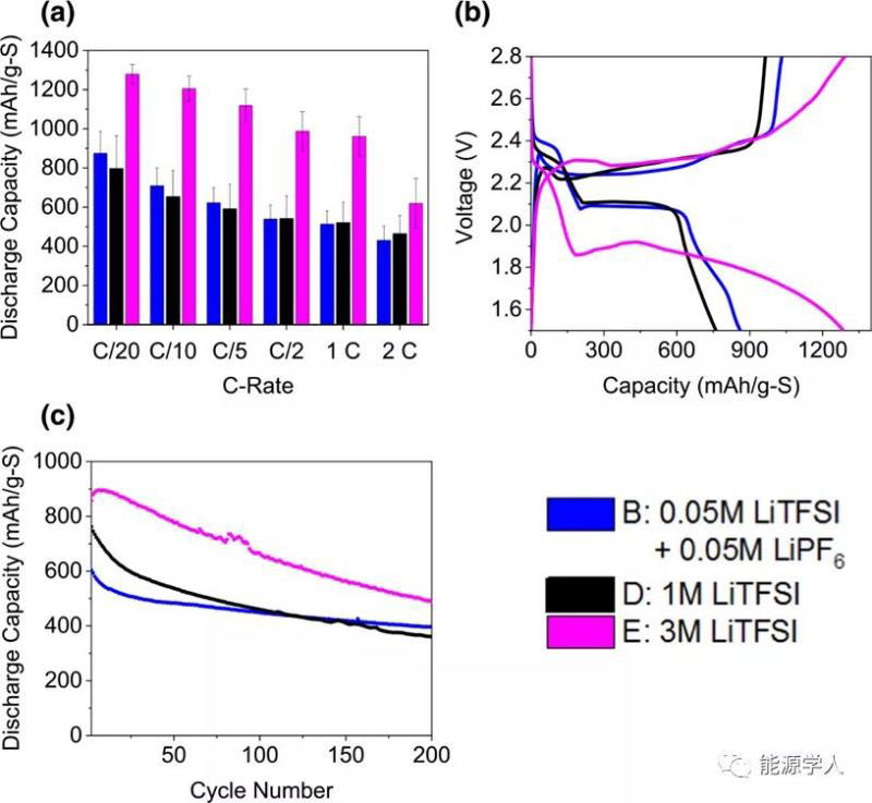 低濃度電解質(zhì)樣品A、B和C顯示出與1M LiTFSI電解質(zhì)相似的容量和電壓滯后,表明鹽濃度高于0.1–0.2M(至約1M)可能是不必要的電解質(zhì)重量和成本增加。樣本B在C倍率上的表現(xiàn)與D相似或更好(圖4a-c)。在誤差范圍內(nèi),1M和低濃度電解質(zhì)之間的差異不顯著,因此,更輕、更便宜的低濃度電解質(zhì)可在不犧牲性能的情況下取代1M LiTFSI電解質(zhì)。即使相對(duì)較薄的電極,高濃度電解質(zhì)(3M LiTFSI樣品E)也能實(shí)現(xiàn)最高容量,但它也具有更高的極化、更高的電阻和低效轉(zhuǎn)化反應(yīng)。而且,如前所述,它的粘度過高、成本增加。相比之下,較便宜且粘度較低的電解質(zhì)A-C提供更平坦的平臺(tái)、顯著較低的遲滯以及與傳統(tǒng)的1M LiTFSI(樣品D)類似或更好的容量。