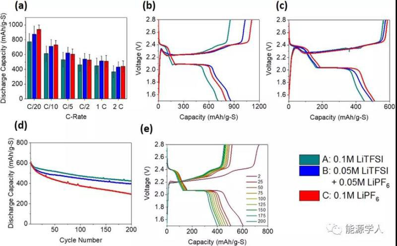 該研究工作將兩種常見的電解質(zhì)鹽LiTFSI和LiPF6,在低濃度下進(jìn)行組合,結(jié)果表明它們的組合產(chǎn)生的容量與傳統(tǒng)的1M LiTFSI電解質(zhì)相當(dāng)。與最初的預(yù)期相反,將電解液濃度從1M降低到0.2M并沒有增加鋰負(fù)極上的多硫化物溶解和Li2S沉積。事實(shí)上,倍率和長循環(huán)測試都顯示低濃度電解質(zhì)的性能與標(biāo)準(zhǔn)1M電解質(zhì)相似或更好。其次,低濃度電解質(zhì)能夠?qū)崿F(xiàn)更低的成本和更高的能量密度,因此,對(duì)其可進(jìn)一步深入研究。