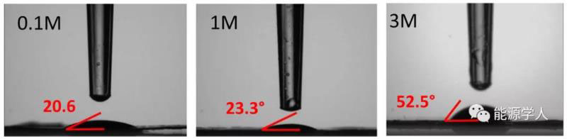 接觸角測量(圖2)顯示了0.1MLiTFSI、1M LiTFSI和3M LiTFSI樣品(A、D和E)的結(jié)果。剩下的電解質(zhì)(樣品B和C)太易揮發(fā),不能形成一滴。1MLiTFSI接觸角僅略高于0.1M LiTFSI,3MLiTFSI則是兩者接觸角的兩倍以上。樣品A、D和E分別用1.5、3和10秒浸潤在電極中,與粘度數(shù)據(jù)相匹配。
