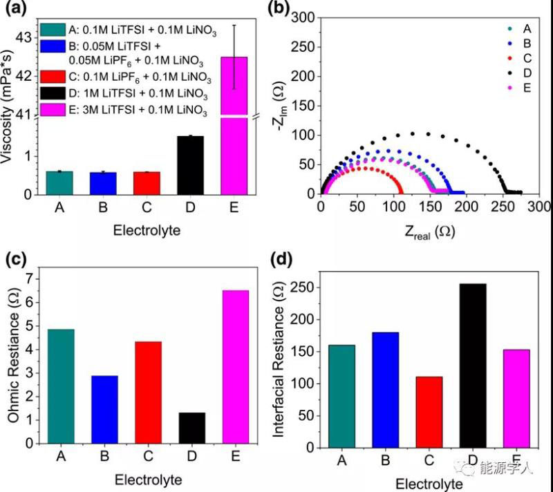 圖1 電解質(zhì)的物理性質(zhì)(a)粘度,(b)Li/Li對(duì)稱電池的EIS,(c)歐姆電阻,(d)Li界面電阻。