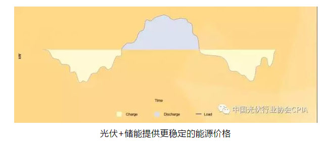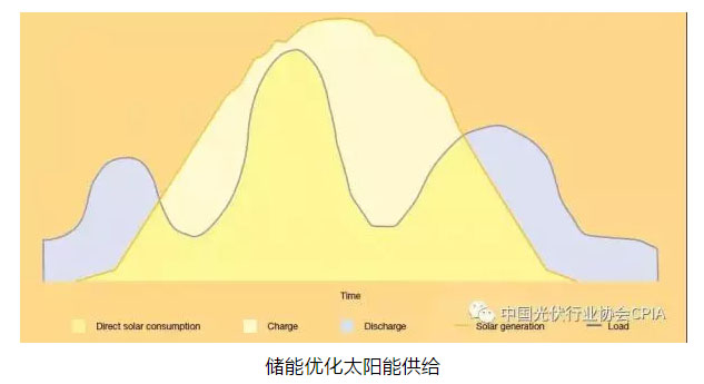 太陽(yáng)能供給曲線(xiàn)(黃色)是變量,與傳統(tǒng)電力需求曲線(xiàn)(藍(lán)色)僅部分保持一致,將光伏+儲(chǔ)能相結(jié)合可以?xún)?chǔ)存多余電量(白色區(qū)域),當(dāng)用戶(hù)需求過(guò)高時(shí)(藍(lán)色區(qū)域),可以將儲(chǔ)存的太陽(yáng)能電量運(yùn)送回輸電網(wǎng),最大限度的利用儲(chǔ)能的技術(shù)潛力。
