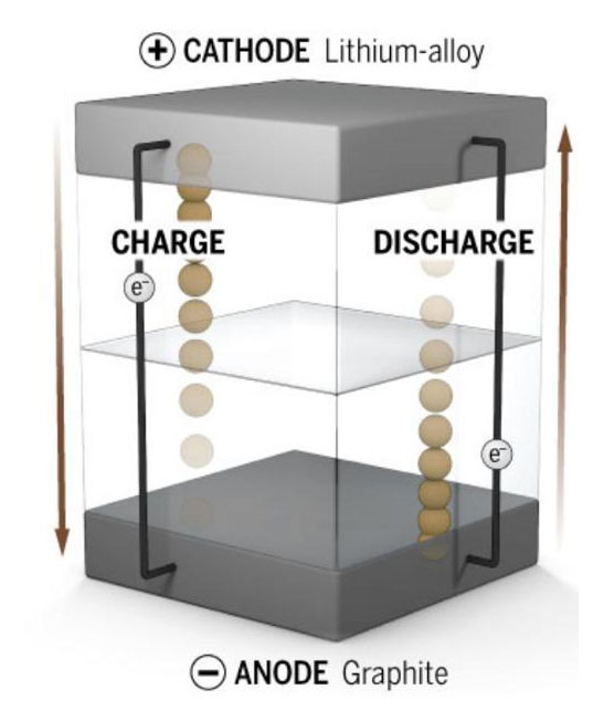 鋰電池的工作機(jī)制跟普通AA或AAA化學(xué)電池類似。它們有陽(yáng)極端子和陰極端子,以及在兩者之間的電解質(zhì)。跟普通電池不同的是,鋰離子電池中的放電反應(yīng)是可逆的,所以電池可以反復(fù)充電。