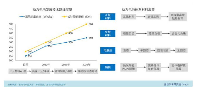 根據(jù)蓋世汽車研究院《新能源汽車動力電池產(chǎn)業(yè)報告(2020版)》預(yù)測分析,2020年前后電池材料將主要向鎳三元+硅碳演變,到2025年富鋰錳基正極材料取得突破,到2030年電解質(zhì)方面取得突破后,有望實現(xiàn)全固態(tài)電池。國內(nèi)鋰電巨頭寧德時代亦認(rèn)為,全固態(tài)電池至少要到2030年才能進(jìn)行大規(guī)模量產(chǎn)。