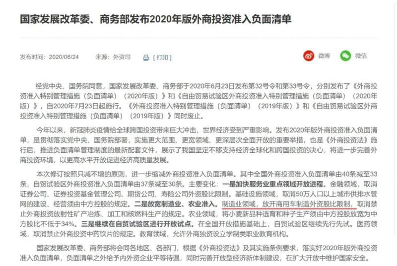 6月24日,國(guó)家發(fā)改委、商務(wù)部聯(lián)合發(fā)布《外商投資準(zhǔn)入特別管理措施(負(fù)面清單)(2020年版)》和《自由貿(mào)易試驗(yàn)區(qū)外商投資準(zhǔn)入特別管理措施(負(fù)面清單)(2020年版)》,將于2020年7月23日起施行。兩文件再次明確,在制造業(yè)領(lǐng)域放開(kāi)商用車制造外資股比限制。