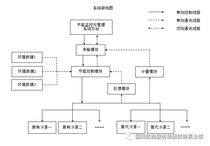 方案的主要由軟件平臺、節(jié)能控制柜(含控制、傳輸、計量、存儲、反饋5大模塊)和末端替代冷源(智能新風機、基站熱管空調(diào)等)組成,系統(tǒng)架構(gòu)可用圖3來表示: