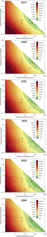 抽水蓄能、壓縮空氣和飛輪儲(chǔ)能在2015年的放電持續(xù)時(shí)間和年循環(huán)次數(shù)組合的整個(gè)頻譜中是最有競(jìng)爭(zhēng)力的技術(shù)。抽水蓄能的優(yōu)勢(shì)在于其良好的循環(huán)壽命以及較低的能量投資成本和中等的功率投資成本。壓縮空氣在超過(guò)45 h的放電應(yīng)用中更具競(jìng)爭(zhēng)力,原因是能量投資成本大大降低。飛輪在年循環(huán)5000次以上和0.5 h以下的放電應(yīng)用中更具競(jìng)爭(zhēng)力,原因是其循環(huán)壽命更長(zhǎng),功率成本更低。