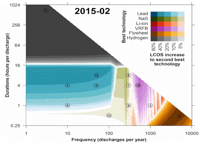 根據(jù)投資成本的下降來(lái)預(yù)測(cè)未來(lái)的LCOS,表明到2020年鋰離子電池將在低放電持續(xù)時(shí)間應(yīng)用場(chǎng)景下具有成本優(yōu)勢(shì),因?yàn)樗鼈兙哂懈玫难h(huán)壽命,因此在高頻充放場(chǎng)景中可以與全釩液流電池和飛輪競(jìng)爭(zhēng)。但是,就以功率為重點(diǎn)的年化容量成本而言,由于在100%深度放電以下工作時(shí)循環(huán)壽命顯著提高,鋰離子電池在與一次響應(yīng)相關(guān)的高頻應(yīng)用組合中具有強(qiáng)大的成本優(yōu)勢(shì)。