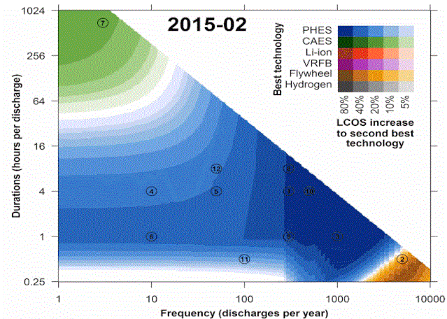 下圖顯示了針對(duì)所有放電時(shí)間和循環(huán)次數(shù)應(yīng)用場(chǎng)景組合的最具成本效益儲(chǔ)能技術(shù)的LCOS,計(jì)算電價(jià)為50 US$/MWh。最低的LCOS是通過(guò)抽水蓄能在中等放電時(shí)間(約4 h)和頻率(約1000次/年)組合下實(shí)現(xiàn)的。2015年,LCOS的范圍為100~150 US$/MWh,相當(dāng)于新建抽水蓄能設(shè)施的成本。LCOS的增加與年循環(huán)次數(shù)和放電持續(xù)時(shí)間的減少成比例,因?yàn)樗鼈儧Q定了全壽命周期內(nèi)所釋放的總能量,即LCOS公式的分母。當(dāng)電價(jià)從50提高10倍,到500 US$/MWh,充放電效率將變得更重要。因此,高效的鋰離子電池將在高循環(huán)次數(shù)應(yīng)用中取代抽水蓄能,還會(huì)在長(zhǎng)放電時(shí)間應(yīng)用中比壓縮空氣和儲(chǔ)氫更具競(jìng)爭(zhēng)力。
