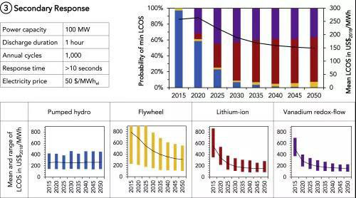 二次響應(yīng)的特點(diǎn)是放電時(shí)間短、充放循環(huán)頻繁。它可以大規(guī)模運(yùn)行并且不需要快速響應(yīng),這使地理?xiàng)l件優(yōu)越的抽水蓄能非常適用。抽水蓄能在2015年的LCOS最低(150~400 US$/MWh),原因是其使用壽命超過(guò)30年,年循環(huán)多達(dá)1000次,盡管其投資成本較高。飛輪儲(chǔ)能的平均LCOS遠(yuǎn)高于抽水蓄能,投資成本的不確定性使得其LCOS最低的可能性很小。預(yù)計(jì)電池技術(shù)的投資成本將大大降低,這意味著到2030年,全釩液流電池和鋰離子電池可能是最具成本效益的技術(shù),盡管其壽命可能分別只有8年和13年。