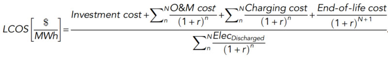 平準(zhǔn)化儲(chǔ)能成本(LCOS)量化了特定儲(chǔ)能技術(shù)和應(yīng)用場(chǎng)景下單位放電量的折現(xiàn)成本。因此,該度量標(biāo)準(zhǔn)考慮了影響放電壽命成本的所有技術(shù)和經(jīng)濟(jì)參數(shù),可以直接與發(fā)電技術(shù)的平準(zhǔn)化度電成本(LCOE)相類(lèi)比,是進(jìn)行儲(chǔ)能技術(shù)成本比較的合適工具。