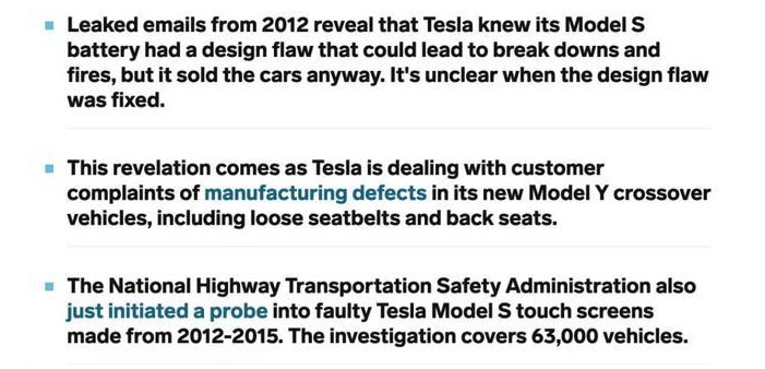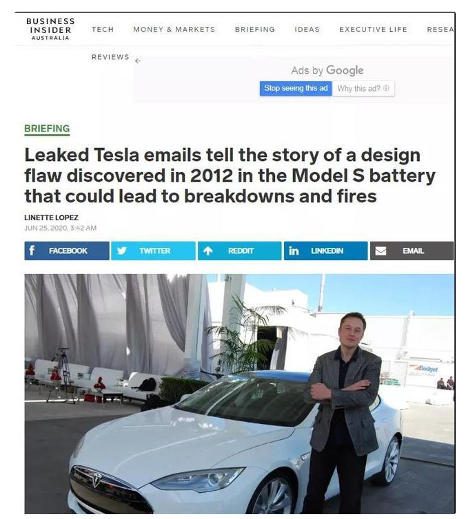 在馬斯克稱貝索斯是抄襲狗之前,外媒Business Insider在25日報道稱,大量泄露的特斯拉郵件顯示,其在2012年就知道Model S因電池設(shè)計不當,可能會導致短路甚至起火,但管理層為了產(chǎn)量和業(yè)績,選擇視而不見。